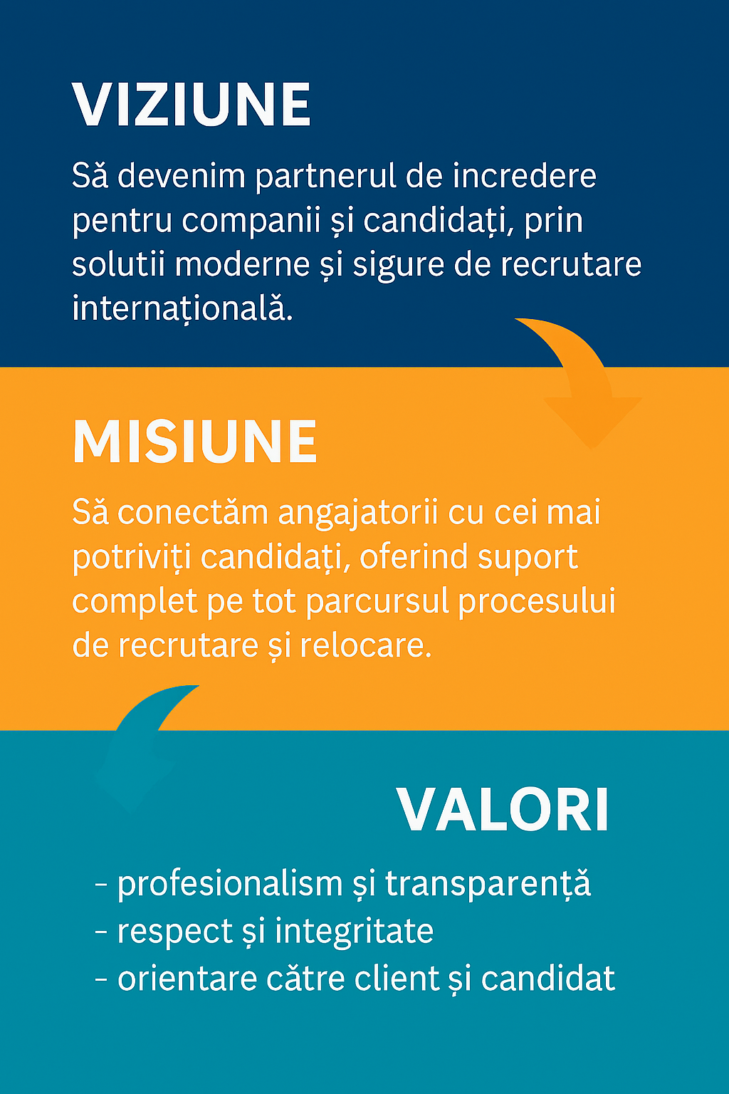 Activitatea noastră acoperă consultanță, întocmirea documentației necesare, recrutarea și selecția candidaților pentru angajare în România. Ne bazăm pe o metodologie atent studiată, care să faciliteze o colaborare corectă între angajatori și candidați, iar ca instrumente de suport punem la dispoziție: